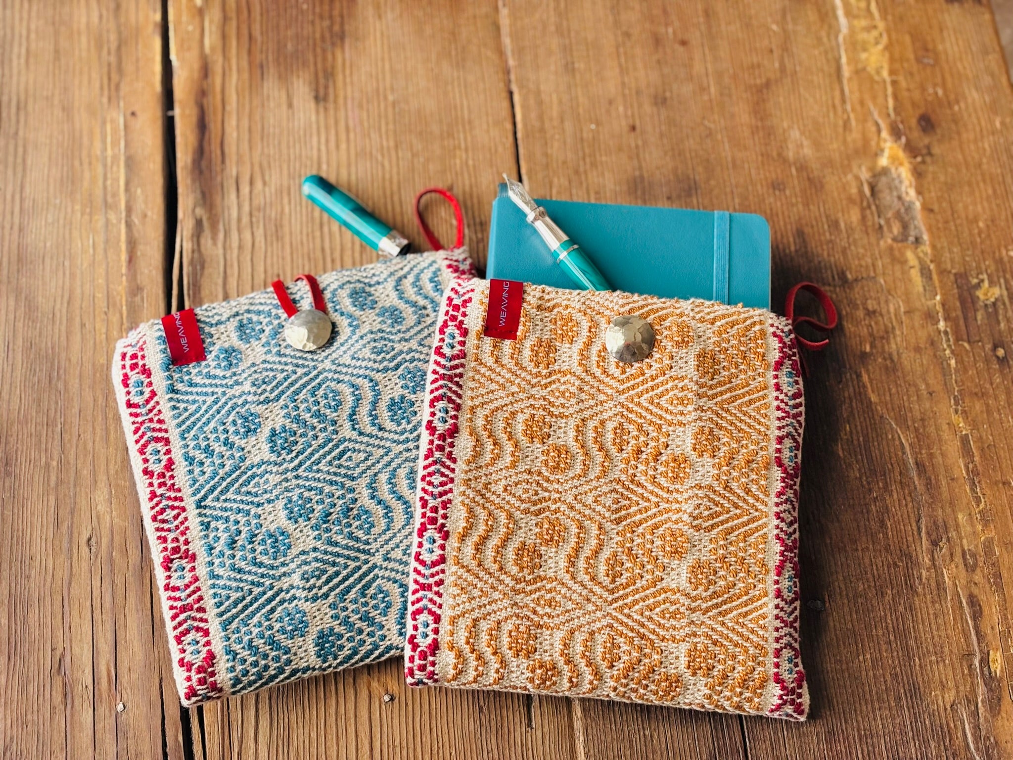 Bring your journal and pen on-the-go in style! Each of these handwoven pouches features a pattern reminiscent of Scandinavian holidays – secured with handforged nickel silver concho buttons custom made by FionaHandworks! 7 x 7 inches. 100% cotton with interior lining.